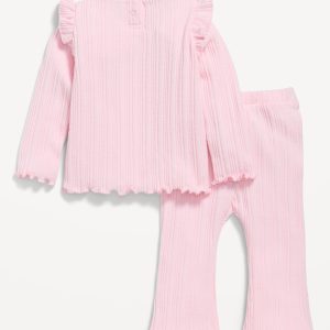 Cozy Long-Sleeve Ribbed Ruffle-Trim Top and Pants Set for Baby