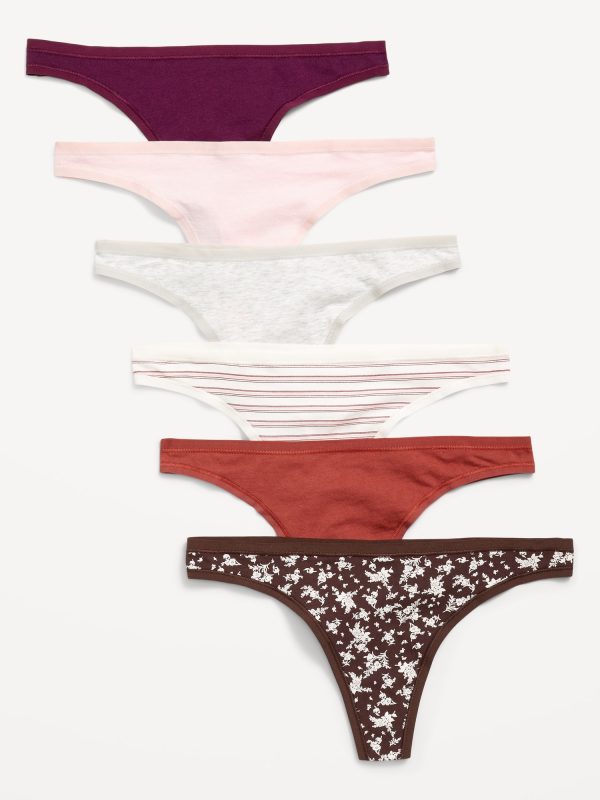 6-Pack Low-Rise Everyday Cotton Thong: pack includes 6 pairs of thong underwear in different colors and prints, elasticized waistband, elasticized leg opening, #684593