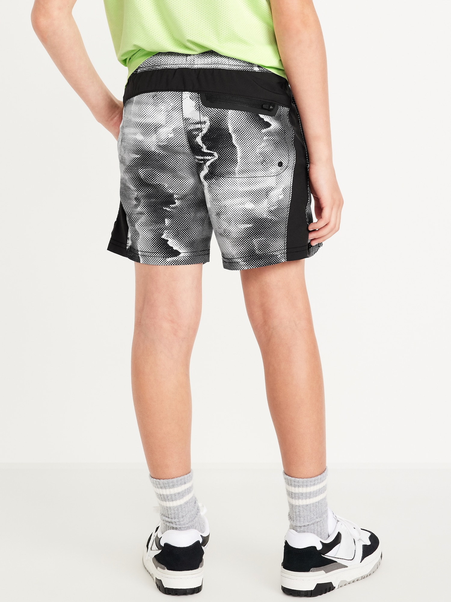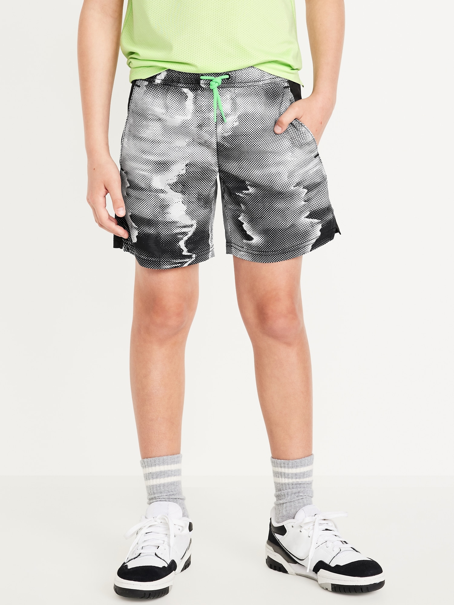 Above Knee StretchTech Performance Shorts for Boys: elasticized waistband, adjustable drawstring, diagonal on-seam pockets, single pocket at back, vented sides at hem, #695609