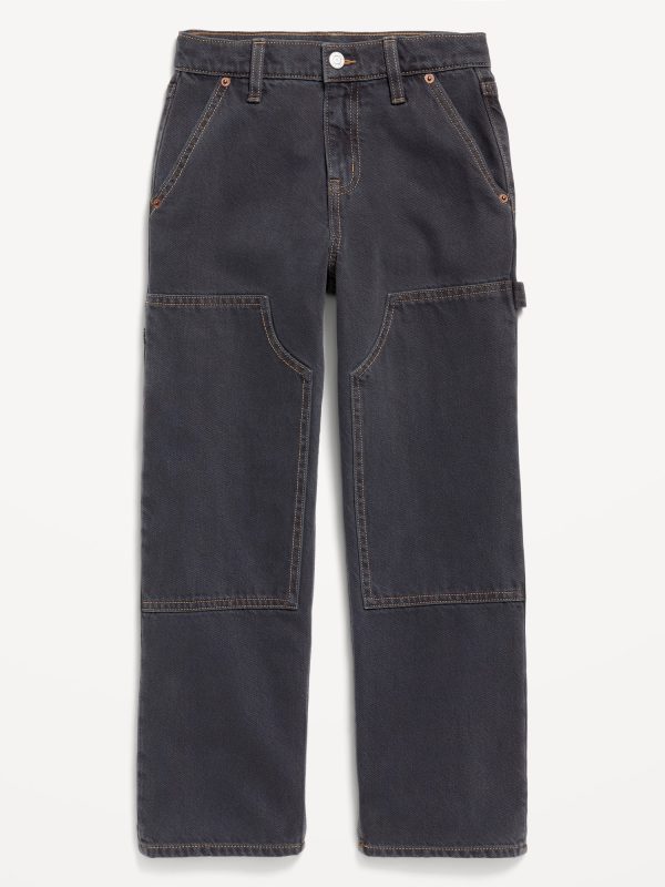 Baggy Carpenter Jeans for Boys: interior adjustable waistband, snap-button closure in sizes 5-8, regular button closure in sizes 10-20, zip fly, diagonal pockets, panel at each leg, utility patch pockets at back, built-in hammer loop at left leg, #766418
