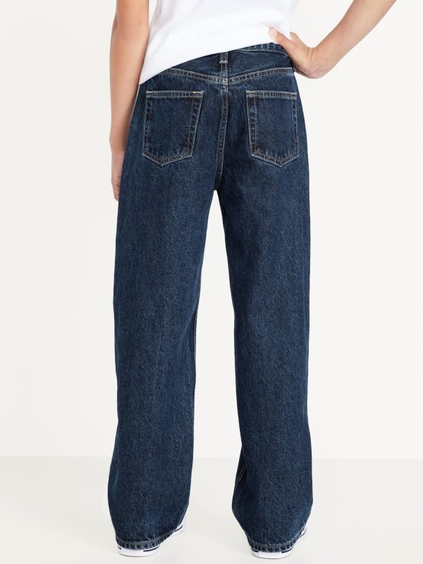 Baggy Non-Stretch Jeans for Boys: interior adjustable waistband, sizes 5-8 snap-button closure, regular button closure sizes 10-20, zip fly, diagonal pockets, utility patch pockets at back, built-in hammer loop at left leg, #805572