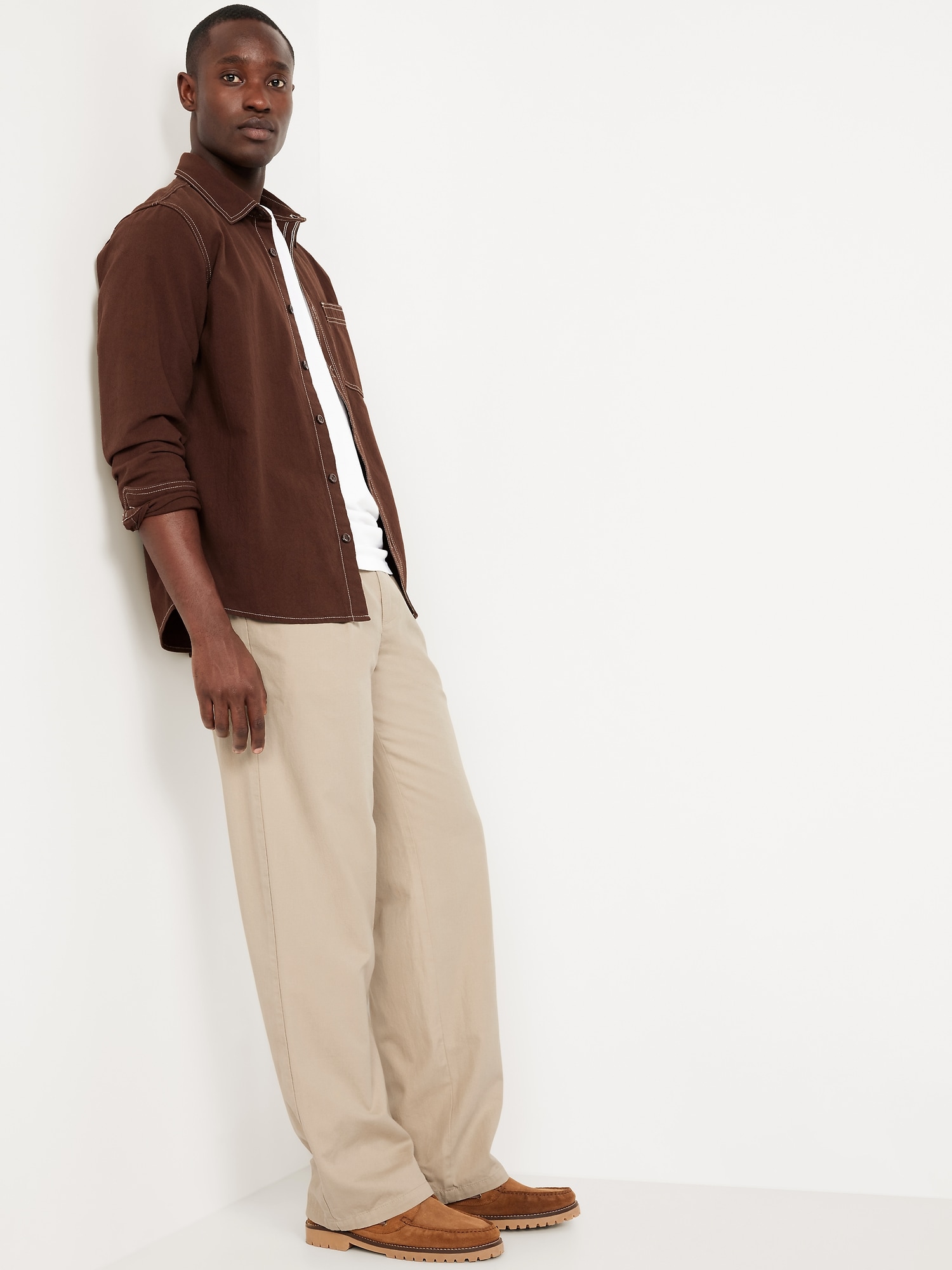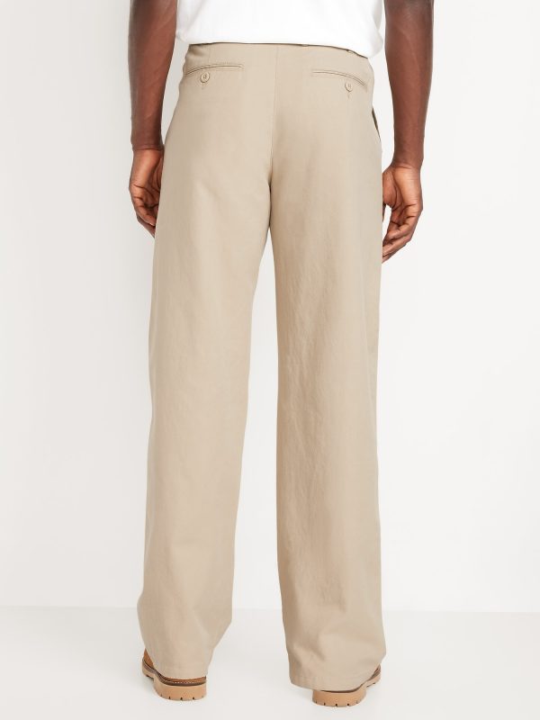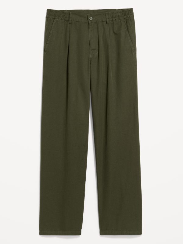 Baggy Pleated Chino Pants: Relaxed from hip to ankle with a laid-back attitude.button-front waistband with elastic sides, belt loops, zip fly, diagonal hip pockets, back button-welt pockets, pleated front, #751389