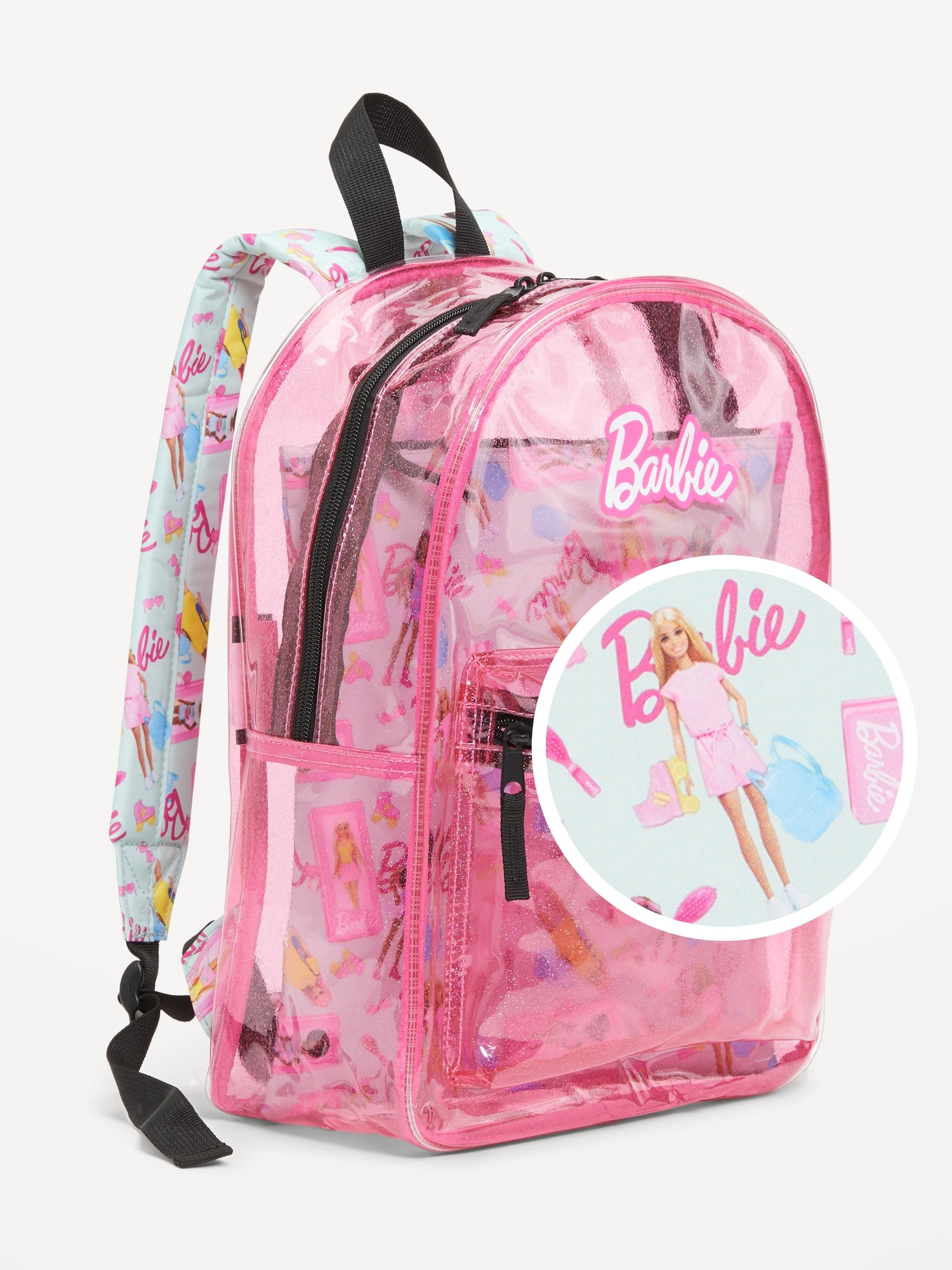 Barbie⢠Clear Backpack for Kids: Pure drip (and perfect for packing extra snacks).zip-top closure, canvas handle, padded shoulder straps with adjustable buckles, exterior zippered pouch compartment, removable interior sleeve compartment, #762504