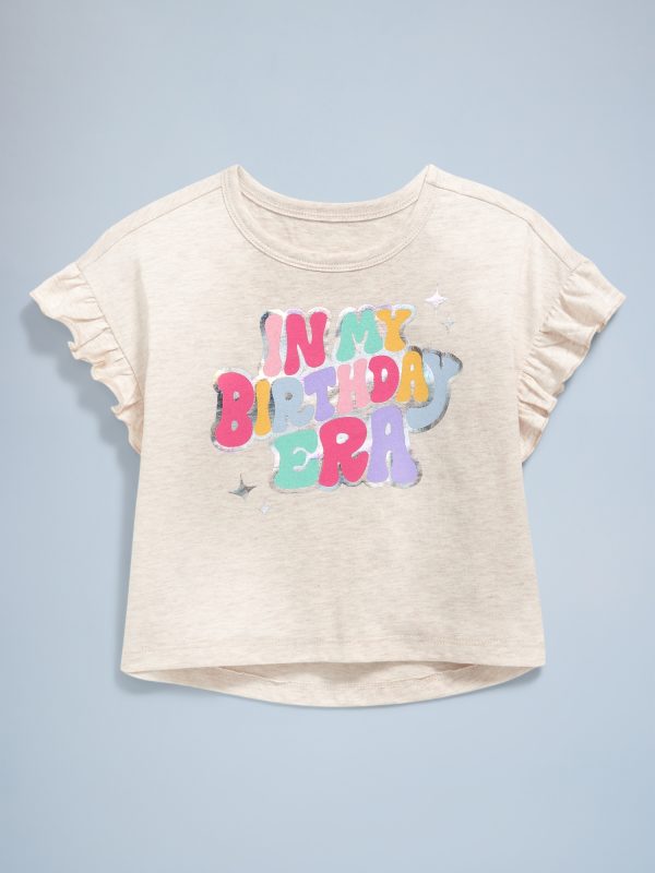 Birthday Graphic T-Shirt for Toddler Girls: The (Bestest) Birthday Shop!crew neck, short ruffle sleeves, graphic at front, rounded hem, #689939
