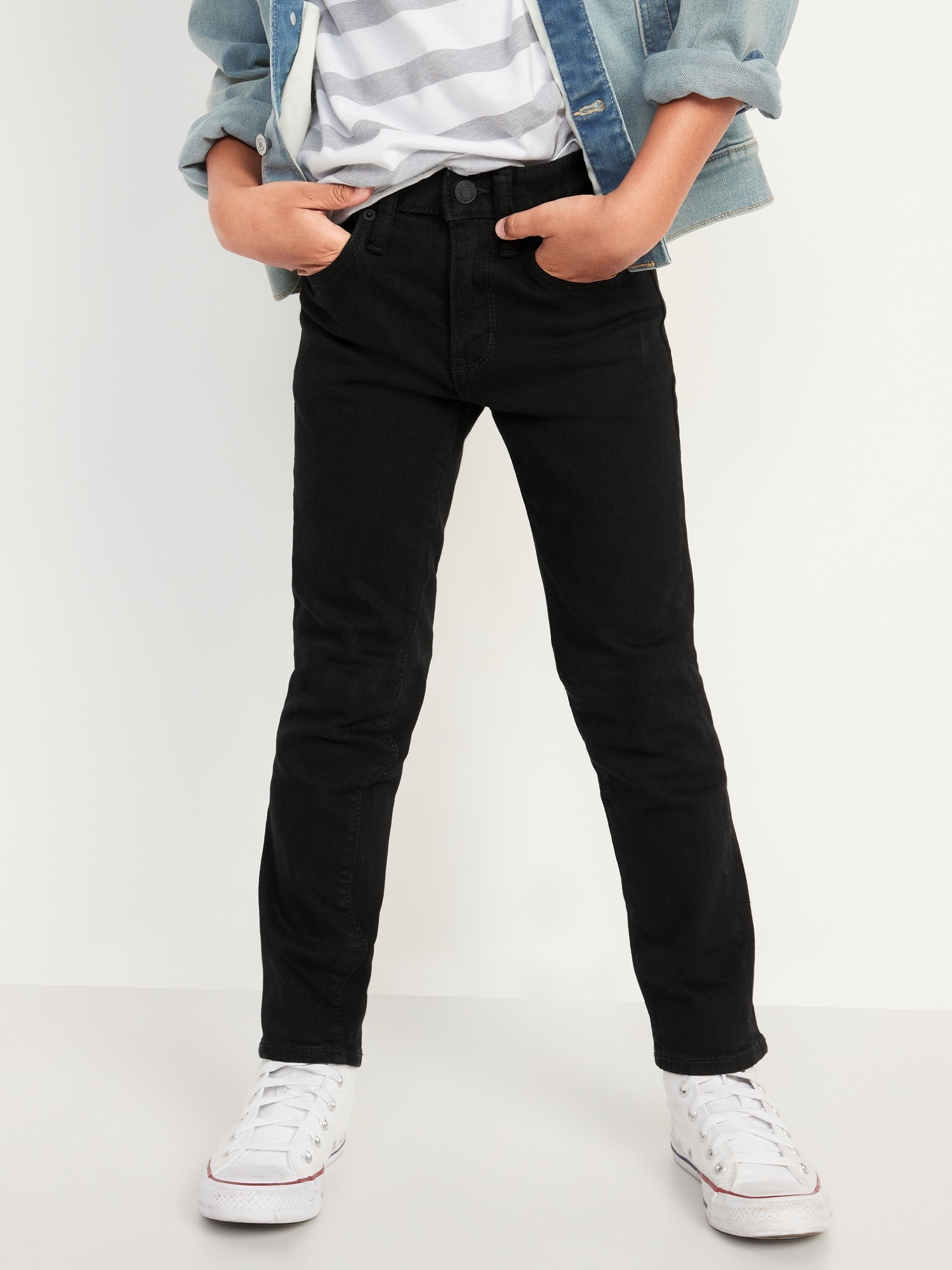 Built-In Flex Black Skinny Jeans For Boys: Comfy, durable, wear-on-repeat faves., Interior adjustable waistband expands for a perfect fit., Snap-button closure in sizes 5-8; regular button closure in sizes 10-18., Button closure and zip fly., Riveted scoop pockets and coin pocket in front; patch pockets in back., Fading at thigh creates a lived-in look., Engineered with innovative Built-In Flex stretch technology. Equal parts comfort & movement., Built-In Tough fabric has 2x the strength of regular denim!, Durable medium-wash denim, with comfortable stretch and contrast topstitching., We’ve updated the fabric content on select colors & patterns of this style. Select inventory may reflect a slightly different fabric content of 91% cotton, 7% recycled cotton, 2% spandex., #723743