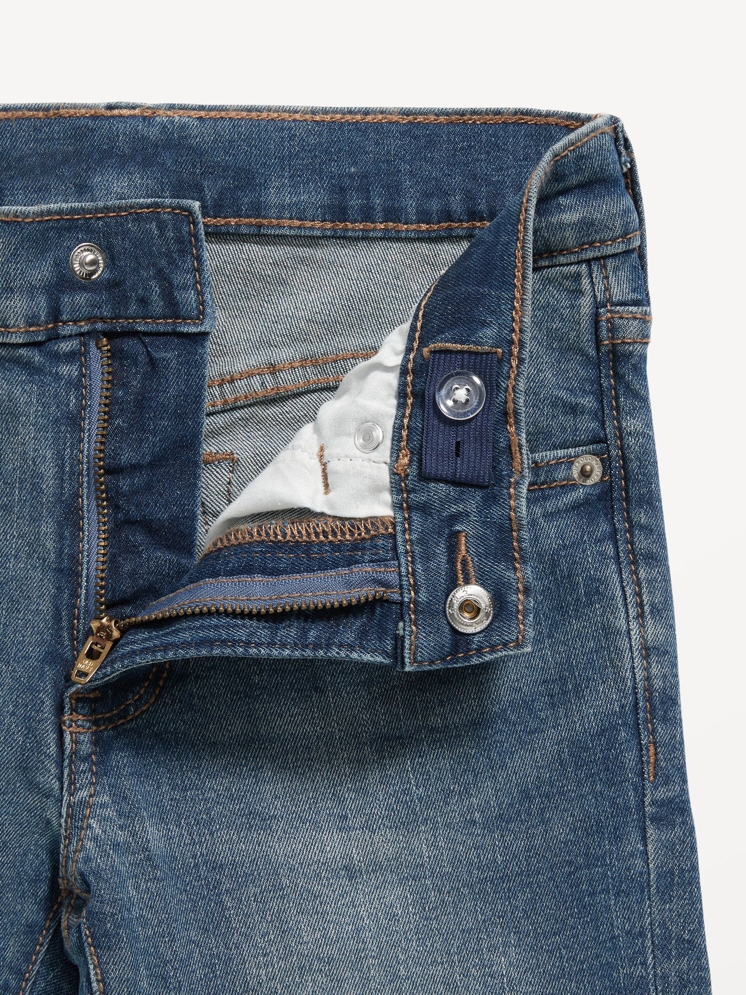 Built-In Flex Skinny Jeans For Boys: Comfy, durable, wear-on-repeat faves., Interior adjustable waistband expands for a perfect fit., Snap-button closure in sizes 5-8; regular button closure in sizes 10-18., Button closure and zip fly., Riveted scoop pockets and coin pocket in front; patch pockets in back., Fading at thigh creates a lived-in look., Engineered with innovative Built-In Flex stretch technology. Equal parts comfort & movement., Built-In Tough fabric has 2x the strength of regular denim!, Durable medium-wash denim, with comfortable stretch and contrast topstitching., We’ve updated the fabric content on select colors & patterns of this style. Select inventory may reflect a slightly different fabric content of 91% cotton, 7% recycled cotton, 2% spandex., #723743