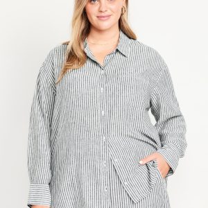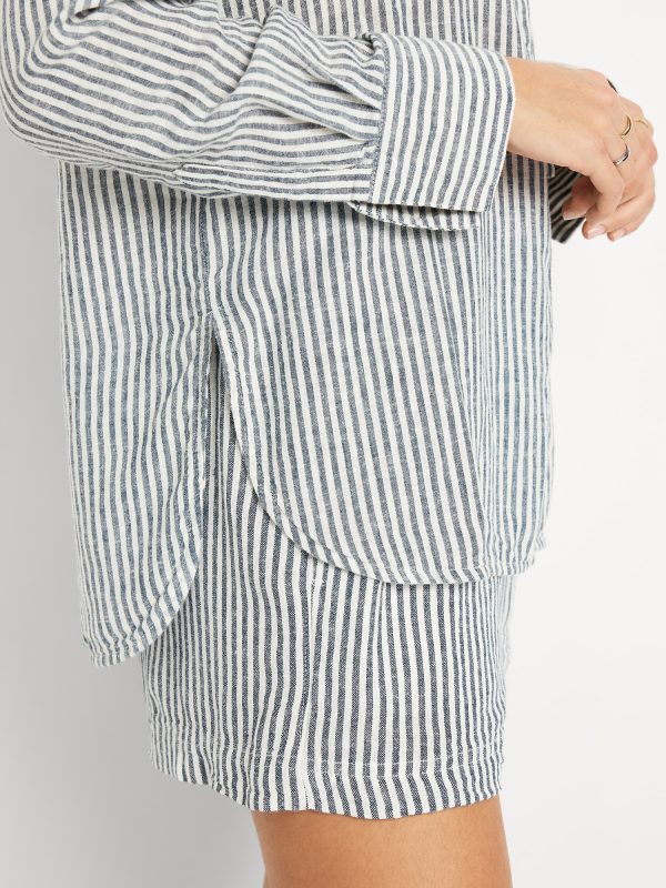 Button-Down Linen-Blend Striped Shirt: spread collar, long sleeves, buttoned cuffs, full-button front, patch chest pocket, curved hi-lo hem, all-over sun print, #745082