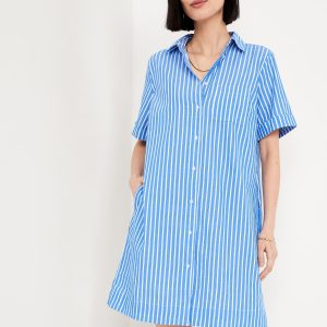 Button-Down Mini Shirt Dress: spread collar, short sleeves, side-seam pockets, patch chest pocket, full-button front, #705355