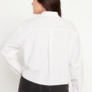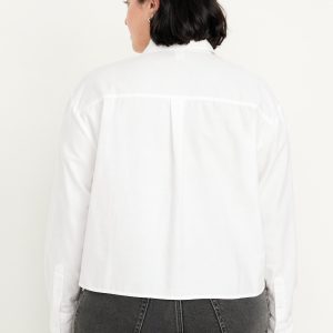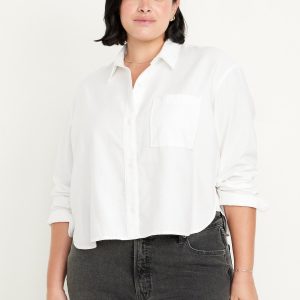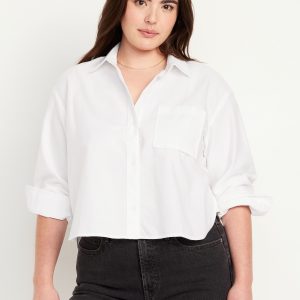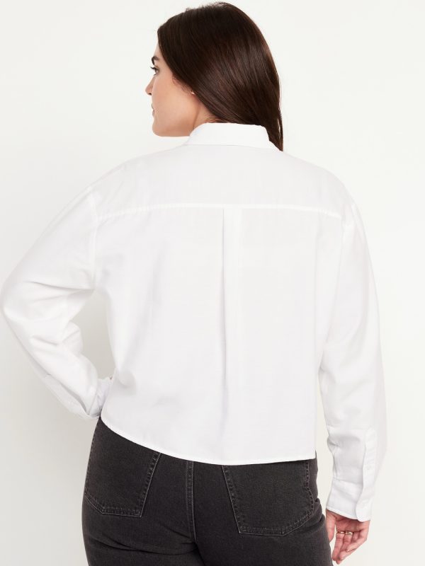 Button-Down Oxford Crop Shirt: spread collar, long sleeves with buttoned cuffs, full-button front, patch chest pocket, vertical striped print, #825106