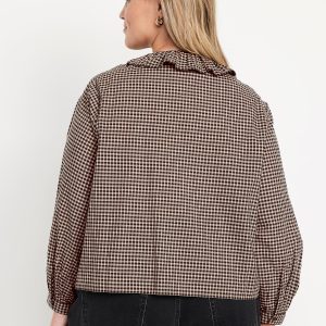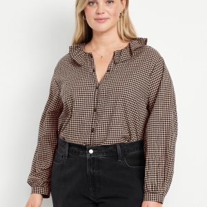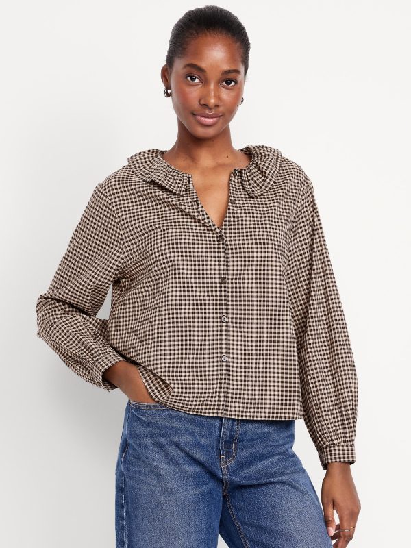 Button-Down Ruffle Shirt: ruffle collar, long sleeves, shirred-button cuffs, full-button front, plaid print, #805732