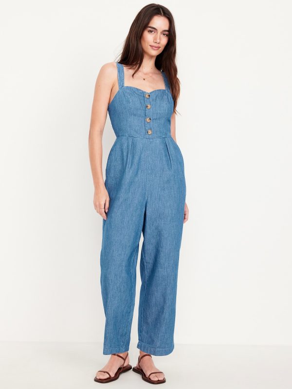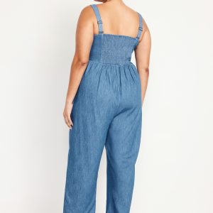 Button-Front Cami Jumpsuit: sweetheart neckline, wide adjustable straps, four-button front, hip pockets, smocked back, #681202