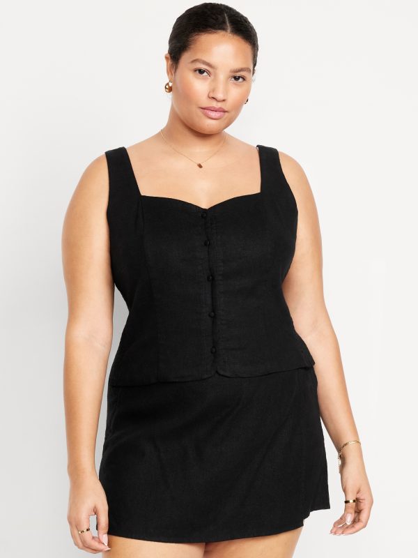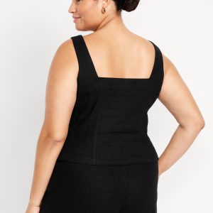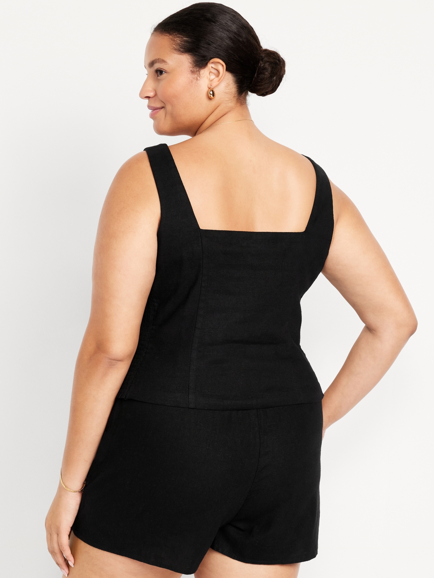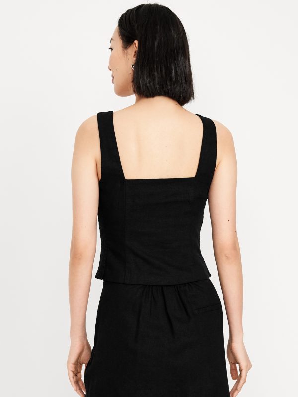 Button-Front Linen-Blend Vest: sweetheart neckline, wide straps, five-button front, smocked side panels, princess seams, striped print, #704099