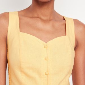 Button-Front Linen-Blend Vest: sweetheart neckline, wide straps, five-button front, smocked side panels, princess seams, striped print, #704099
