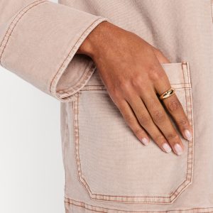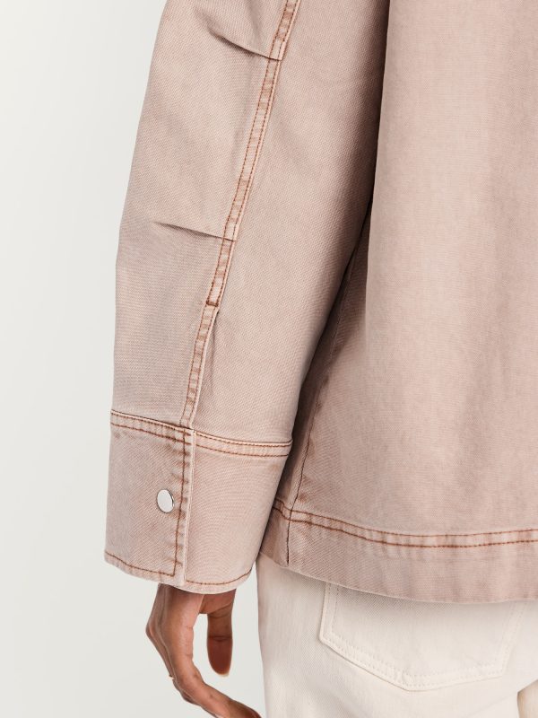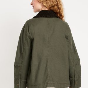 Canvas Barn Jacket: corduroy collar, long sleeves with snap cuffs, full-snap front with hidden zipper, patch pockets, #766357