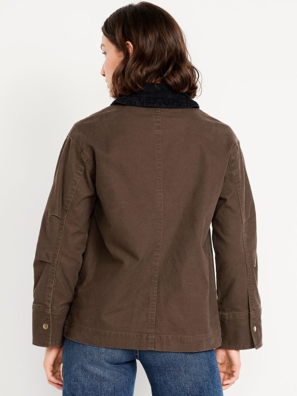 Canvas Barn Jacket: corduroy collar, long sleeves with snap cuffs, full-snap front with hidden zipper, patch pockets, #766357