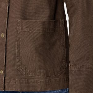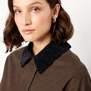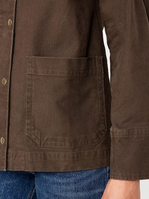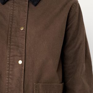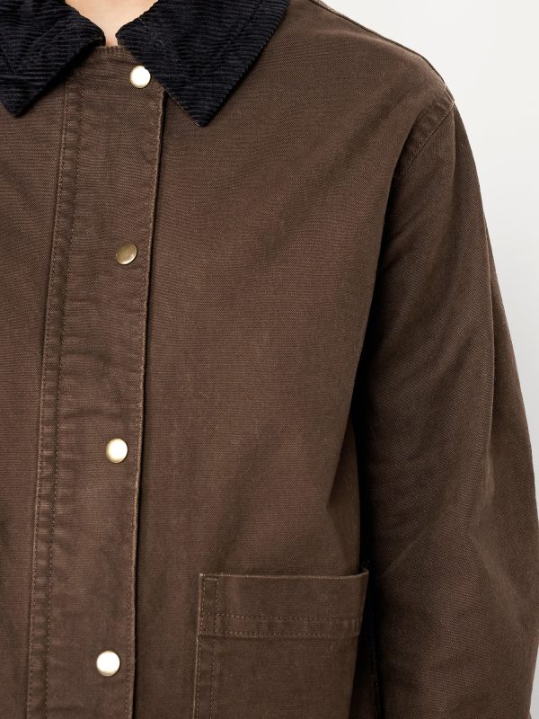 Canvas Barn Jacket: corduroy collar, long sleeves with snap cuffs, full-snap front with hidden zipper, patch pockets, #766357