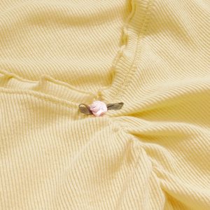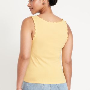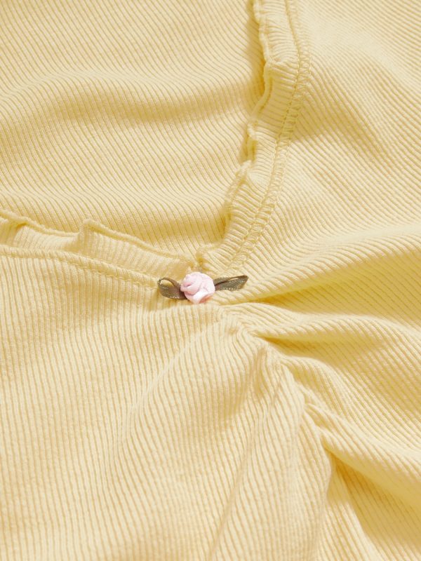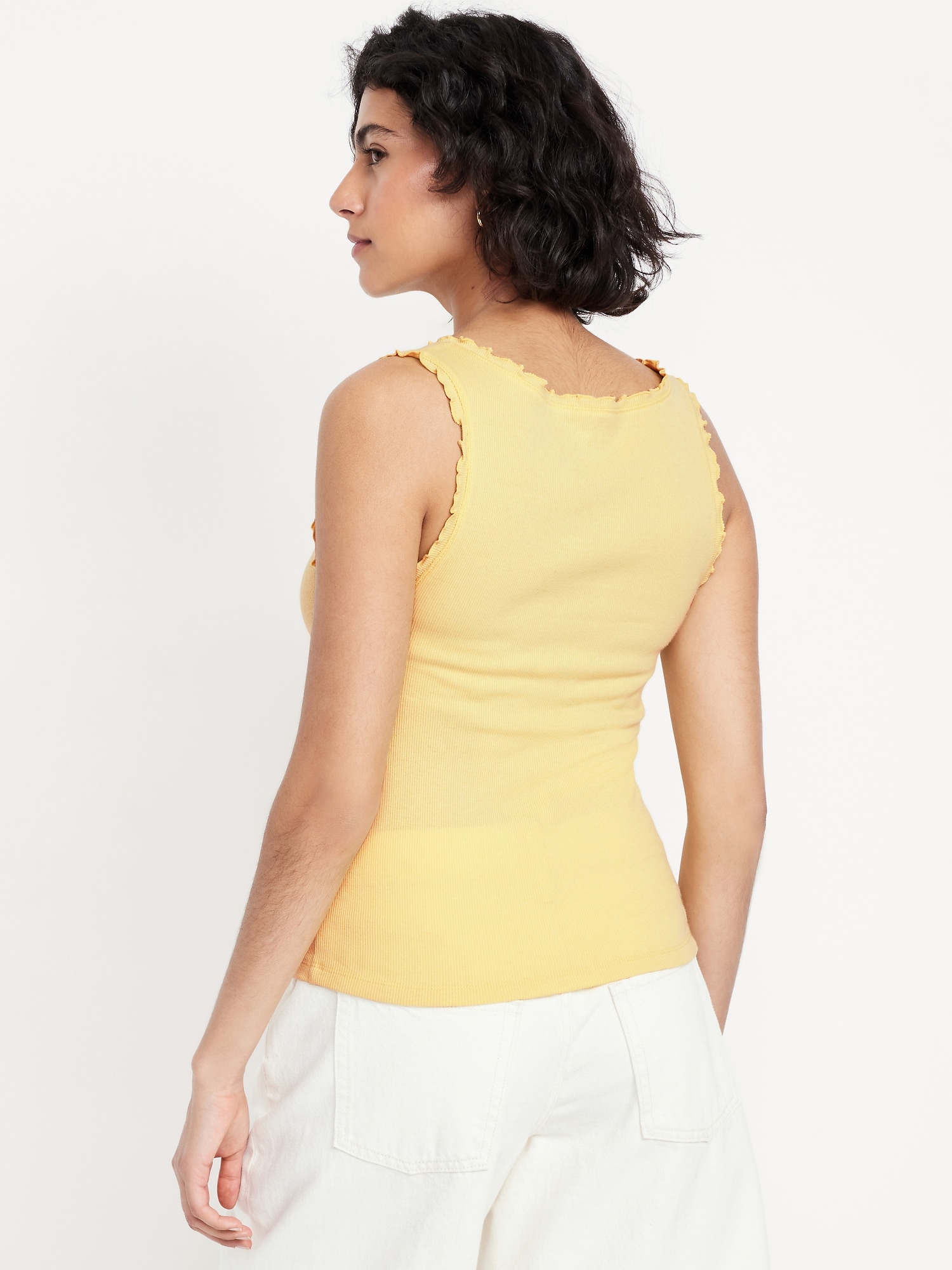 Cinched Rib-Knit Tank Top: deep v-neck, wide ruffled straps, cinched front with rosette applique, #791559