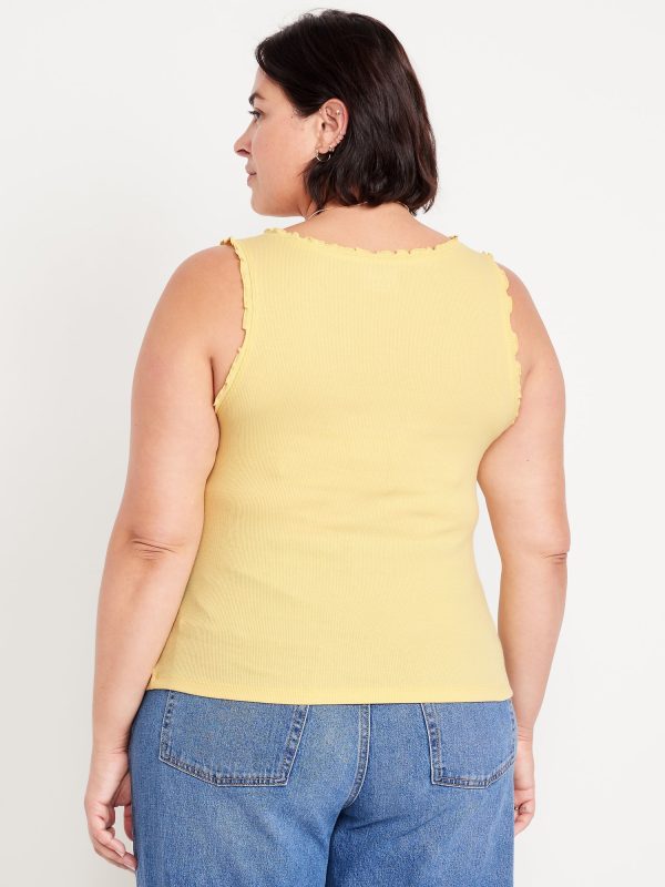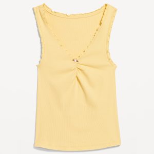 Cinched Rib-Knit Tank Top: deep v-neck, wide ruffled straps, cinched front with rosette applique, #791559