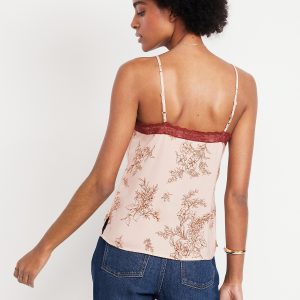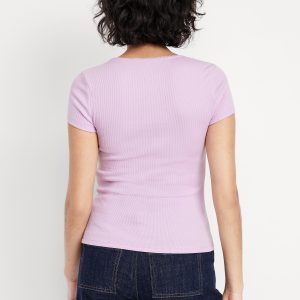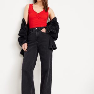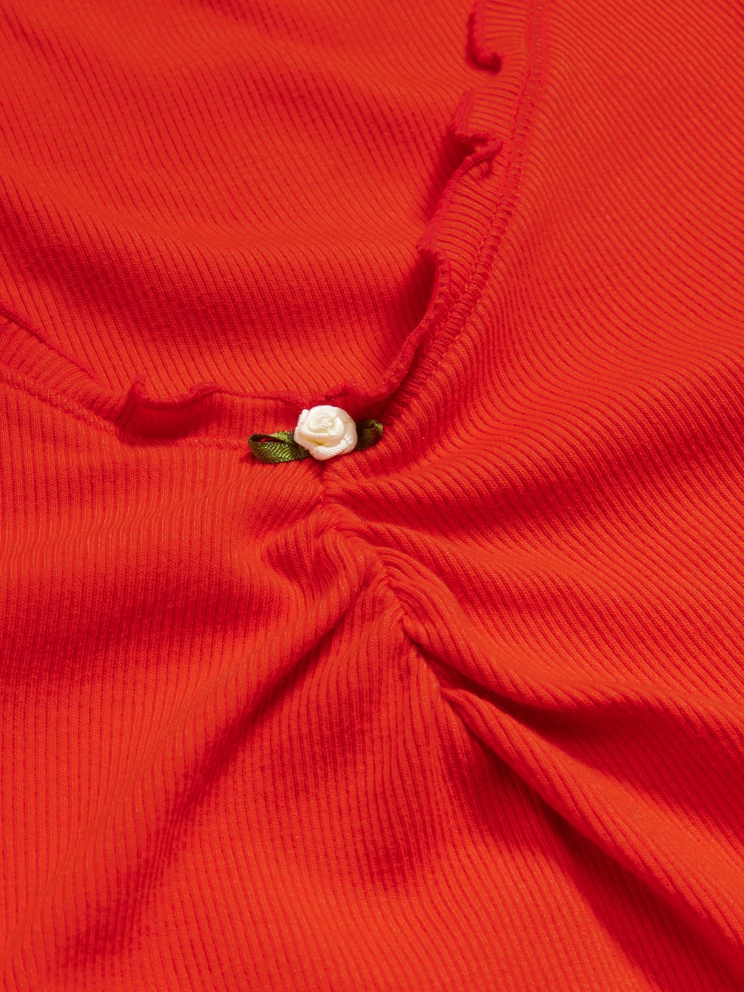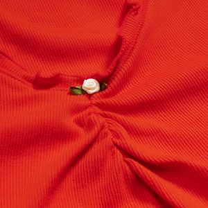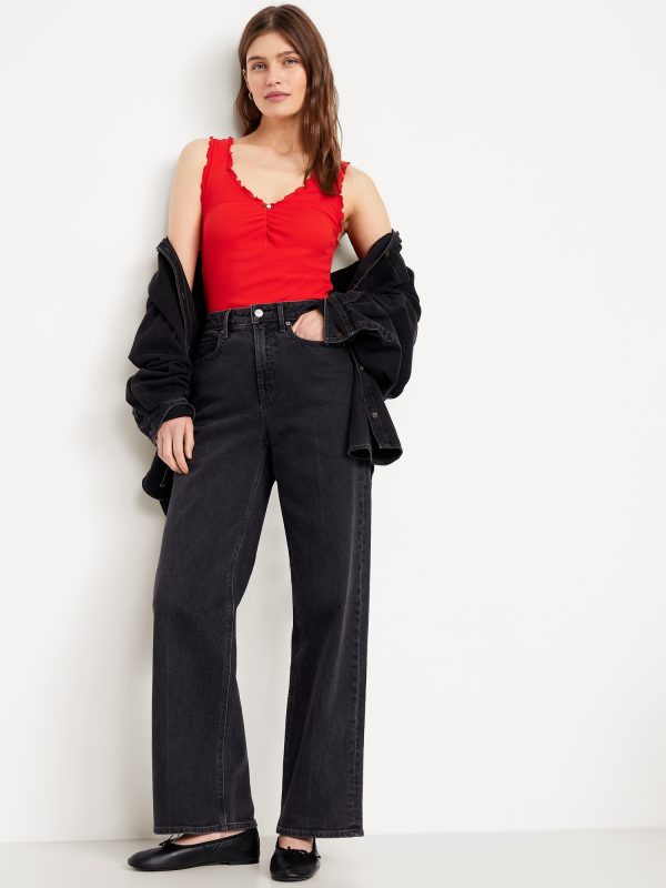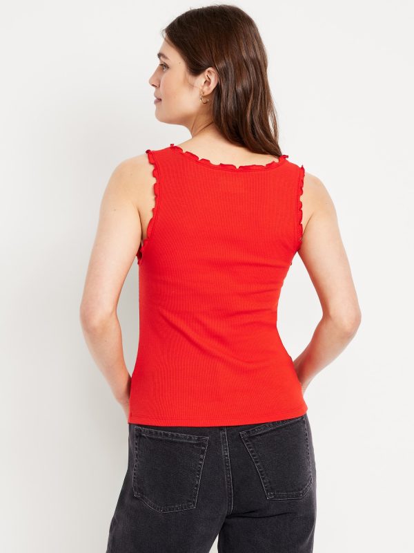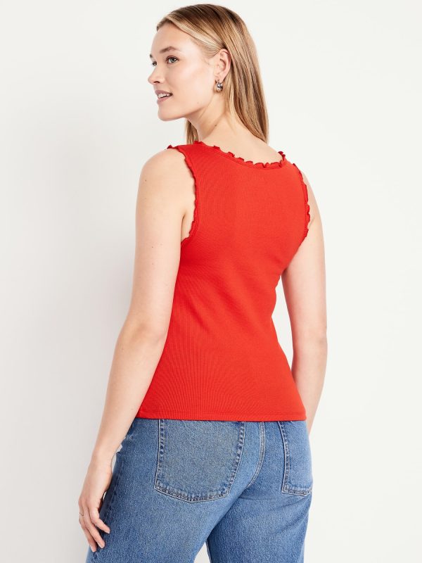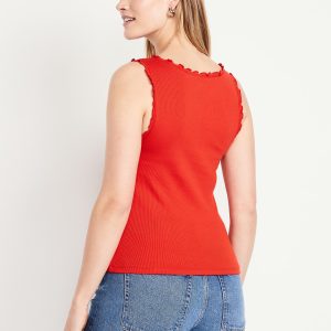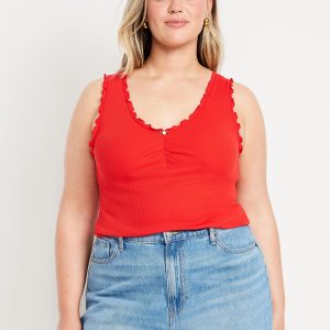 Cinched Rib-Knit Tank Top: deep v-neck, wide ruffled straps, cinched front with rosette applique, #791559