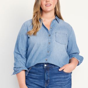 Classic Button-Down Jean Shirt: spread collar, long sleeves, buttoned cuffs, button front, patch chest pocket, curved hem, fading, #576683
