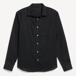 Classic Fit Linen-Blend Shirt: spread collar, long sleeves, buttoned cuffs, full-button front, patch chest pocket, #691163