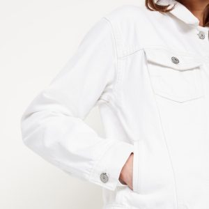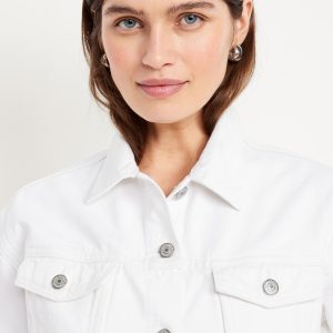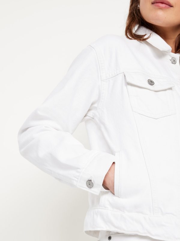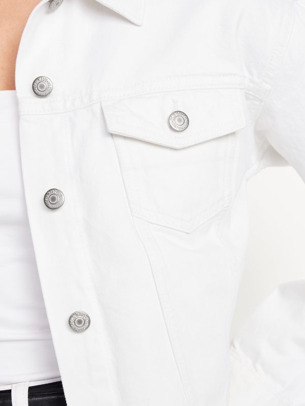 Classic Jean Jacket: spread collar, long sleeves, buttoned cuffs, flap-button chest pockets, on-seam front pockets, full-button front, banded hem, adjustable button tabs at back waist, #467752