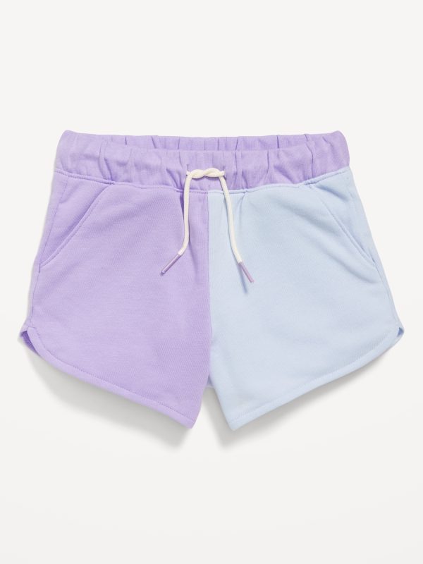 Color-Block Graphic French-Terry Shorts for Toddler Girls: elasticized waistband, functional drawstring, diagonal on-seam pockets, small-scale logo graphic, dolphin hem, #690582