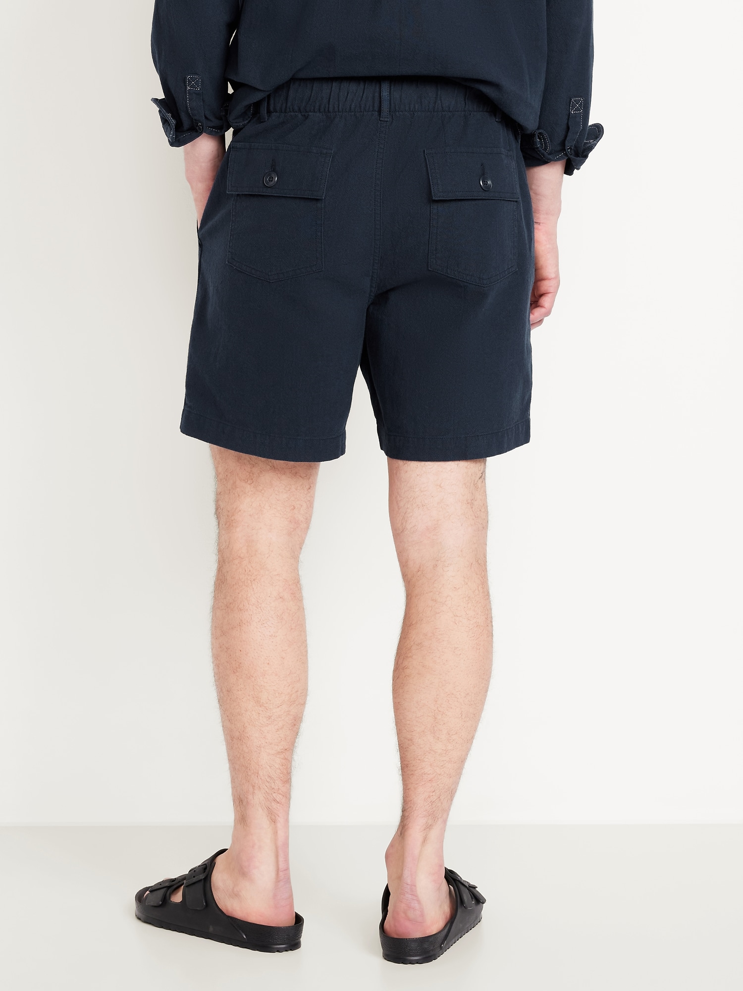 Crepe Workwear Shorts — 7-inch inseam: elastic-drawstring waistband, button front, front utility pockets, back button-flap pockets, easy pull-on style, #751383