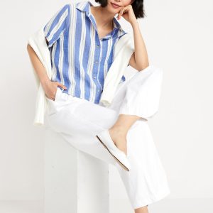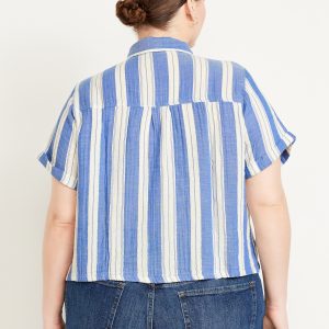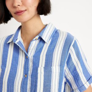 Crinkle Gauze Button-Down Striped Shirt: Drapey, laid-back and ready for the breeze.spread collar, short sleeves, full-button front, seamed back yoke, #704203