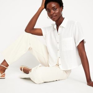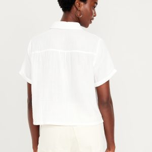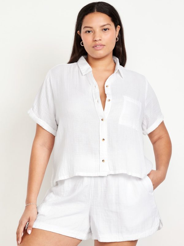 Crinkle Gauze Loose Button-Down Shirt: Drapey, laid-back and ready for the breeze.spread collar, short sleeves, full-button front, seamed back yoke, #704203
