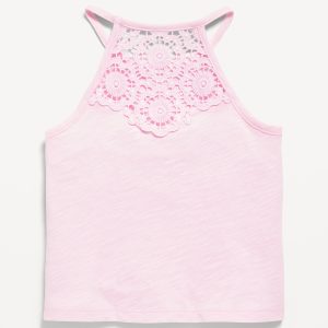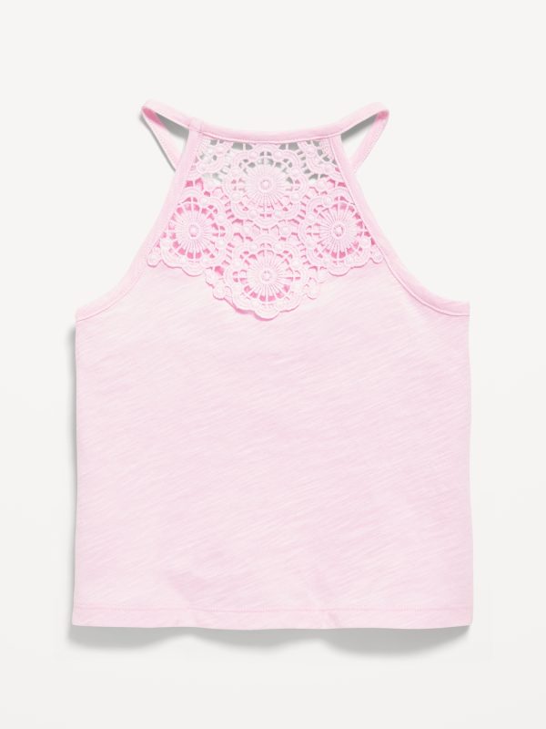 Crochet Back Halter Tank Top for Girls: round neckline, sleeveless, button closure and keyhole cutout at nape, crochet knit trim along neckline and sleeve cuffs, rounded hem, #767961