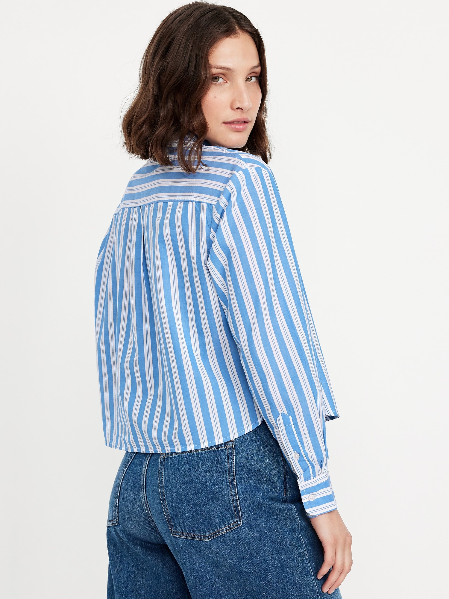 Cropped Button-Down Shirt: spread collar, long sleeves with buttoned cuffs, full-button front, patch chest pocket, vertical striped print, #825106