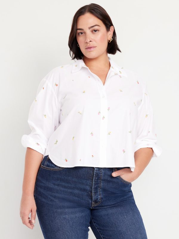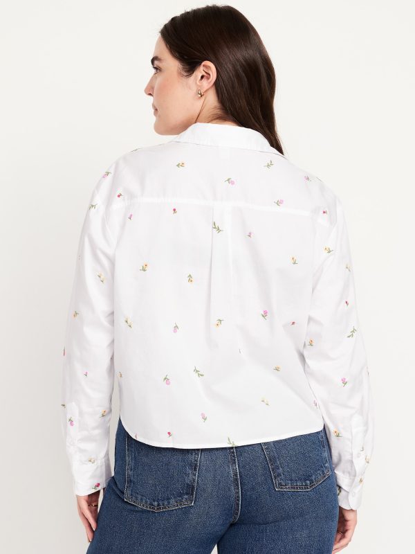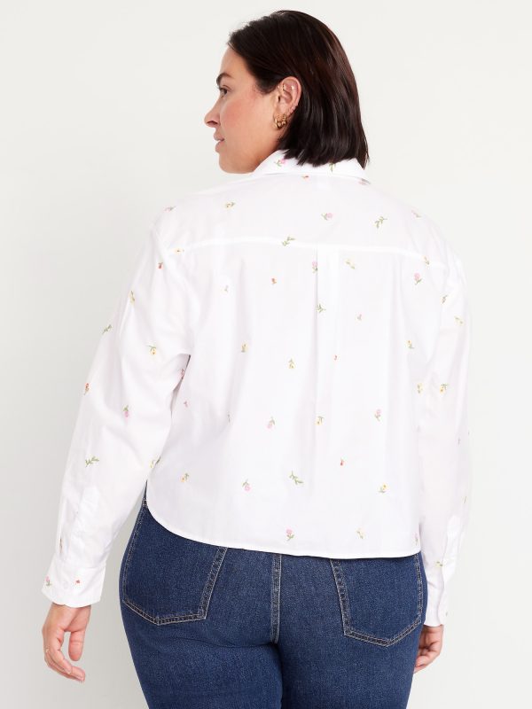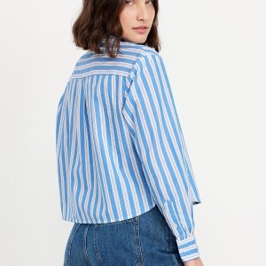 Cropped Button-Down Shirt: spread collar, long sleeves with buttoned cuffs, full-button front, patch chest pocket, vertical striped print, #825106