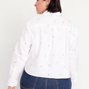 Cropped Button-Down Shirt: spread collar, long sleeves with buttoned cuffs, full-button front, patch chest pocket, vertical striped print, #825106