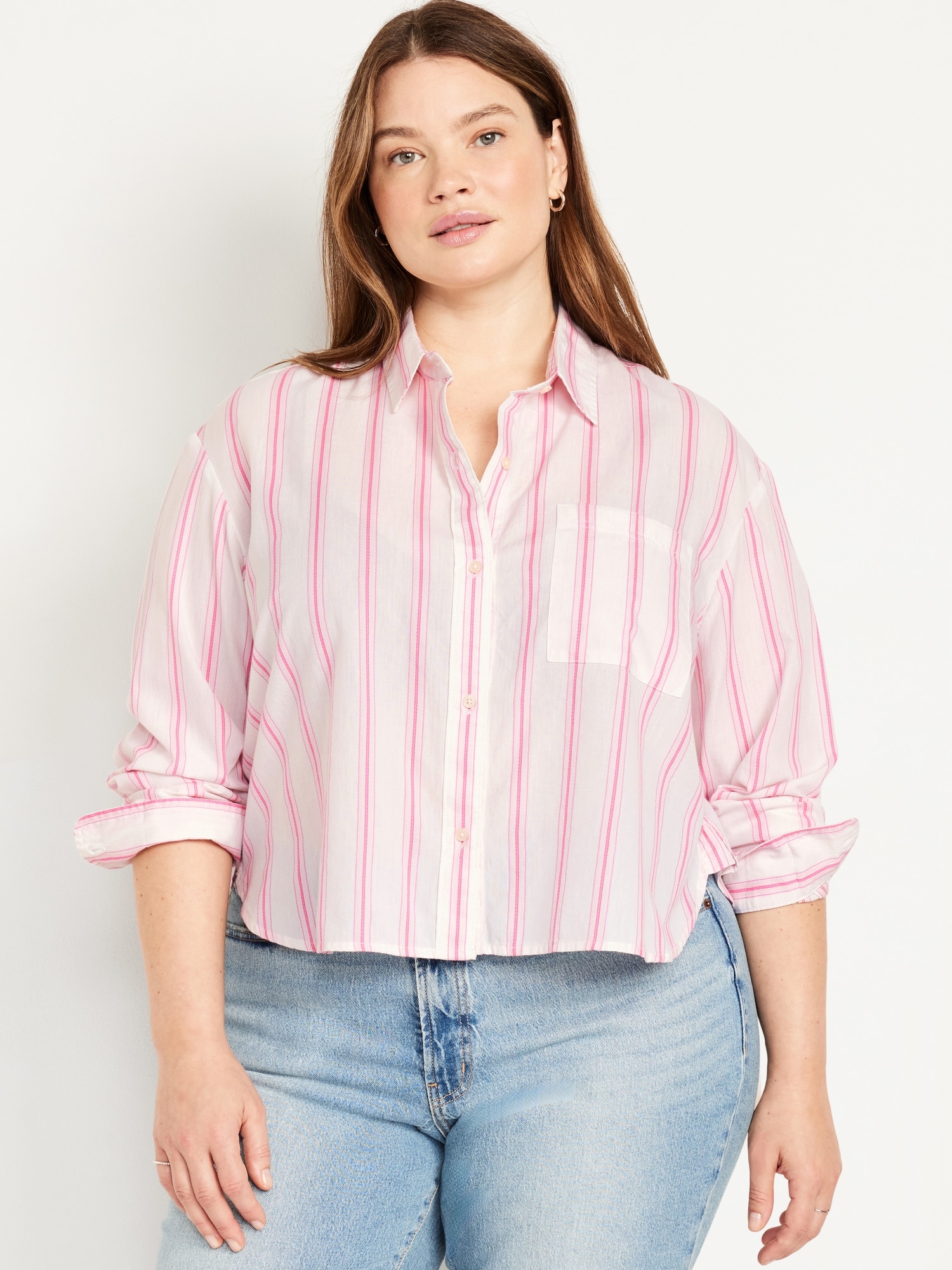Cropped Button-Down Striped Shirt: spread collar, long sleeves with buttoned cuffs, full-button front, patch chest pocket, vertical striped print, #825106