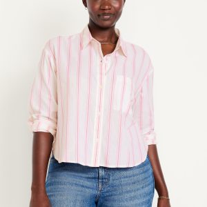 Cropped Button-Down Striped Shirt: spread collar, long sleeves with buttoned cuffs, full-button front, patch chest pocket, vertical striped print, #825106