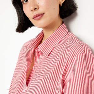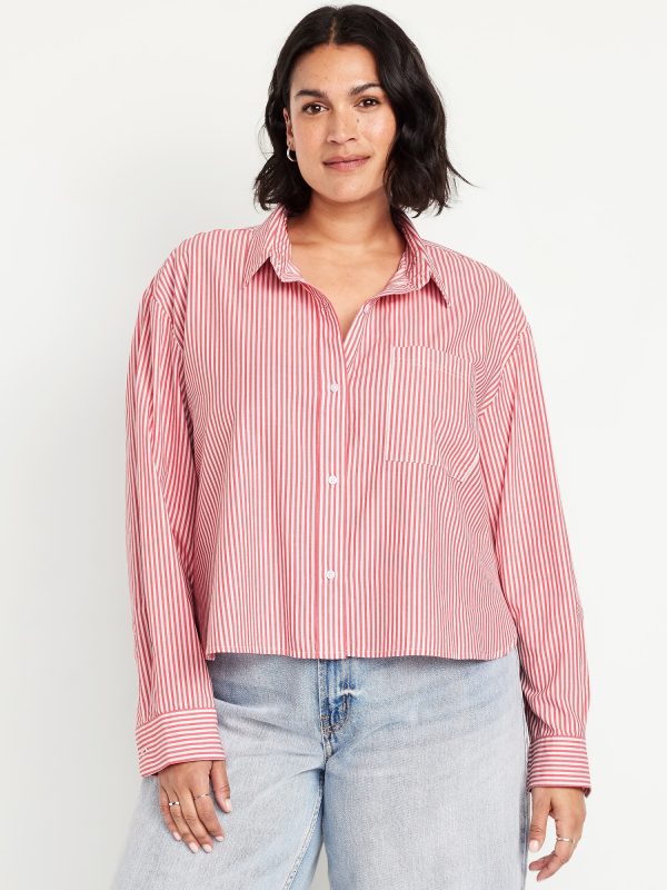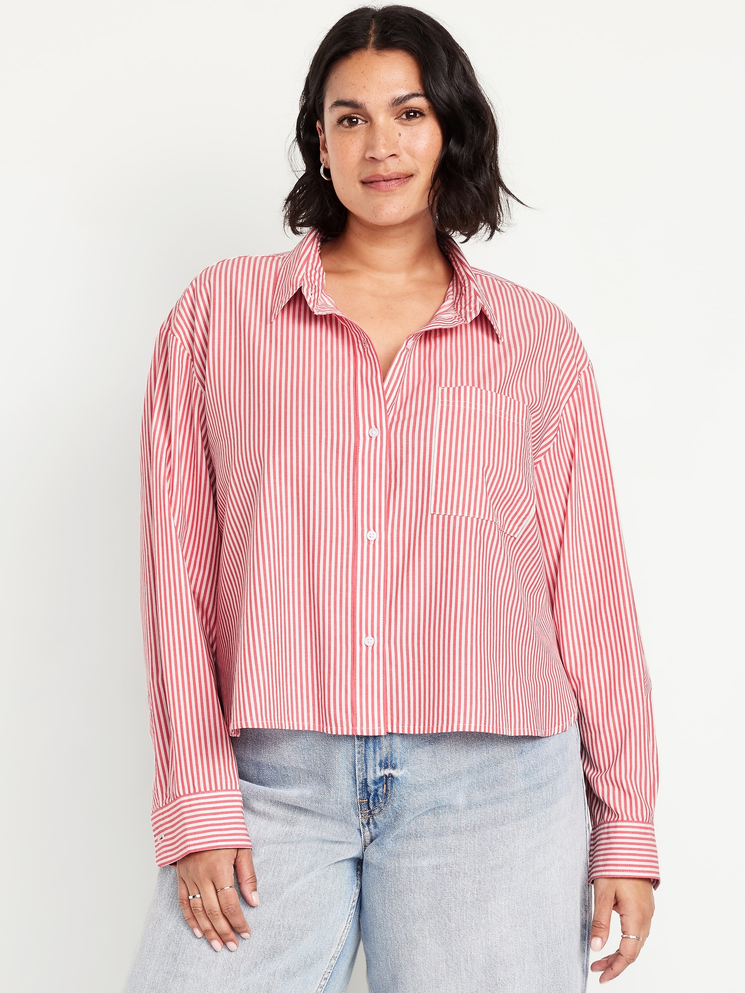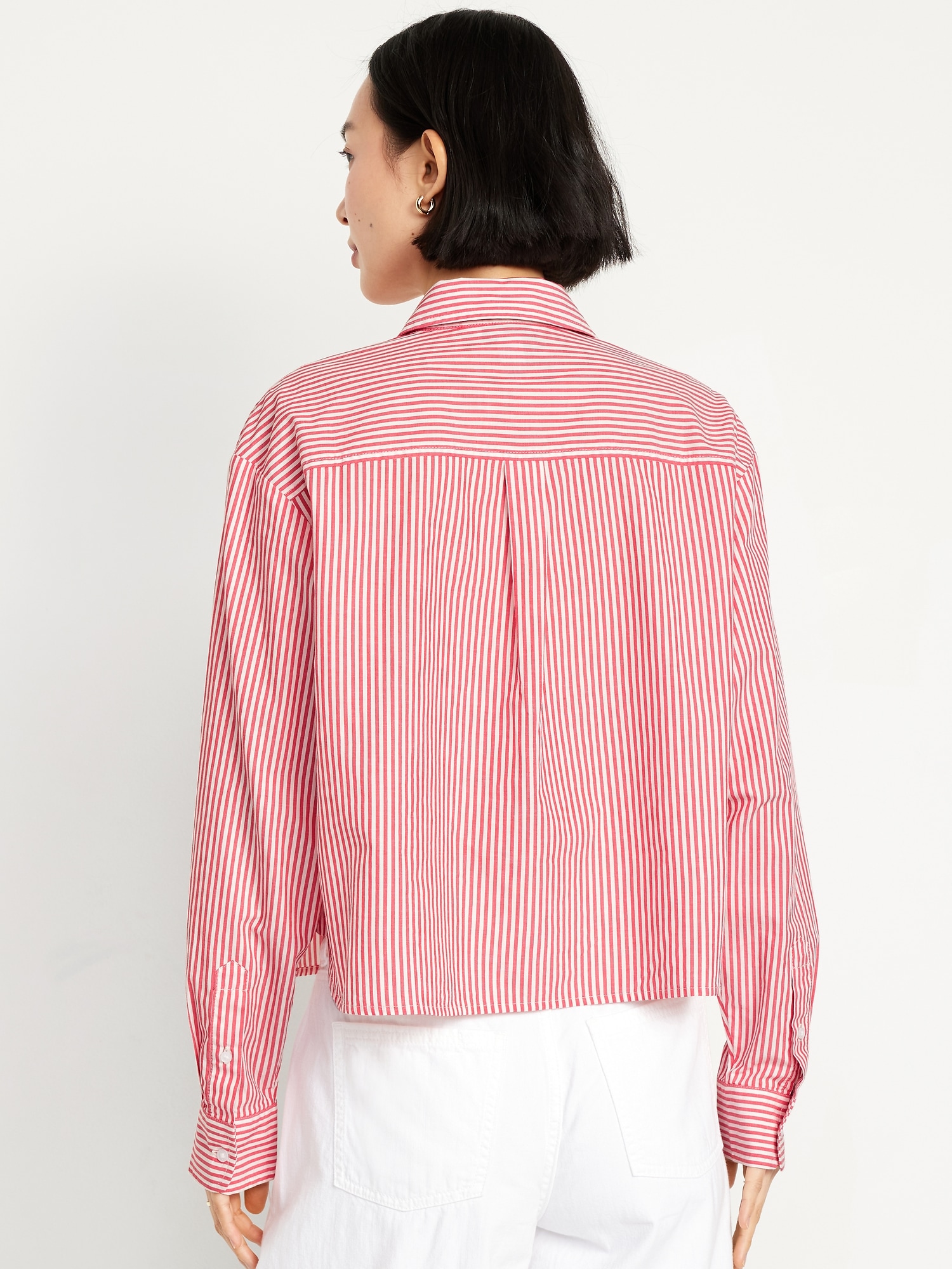 Cropped Button-Down Striped Shirt: spread collar, long sleeves with buttoned cuffs, full-button front, patch chest pocket, vertical striped print, #825106