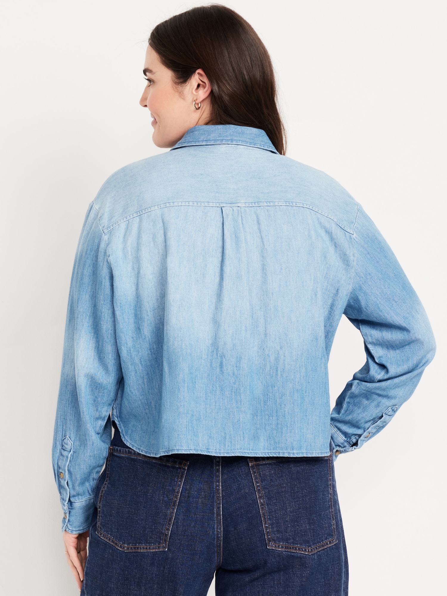 Cropped Jean Button-Down Shirt: spread collar, long sleeves with buttoned cuffs, full-button front, patch chest pocket, vertical striped print, #825106