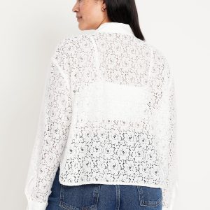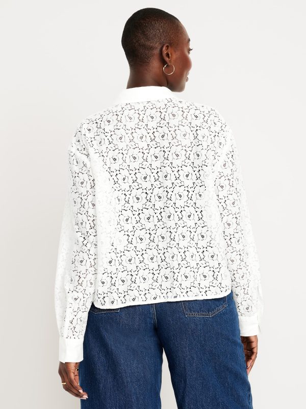 Cropped Lace Button-Down Shirt: spread collar, long sleeves with buttoned cuffs, full-button front, patch chest pocket, vertical striped print, #825106