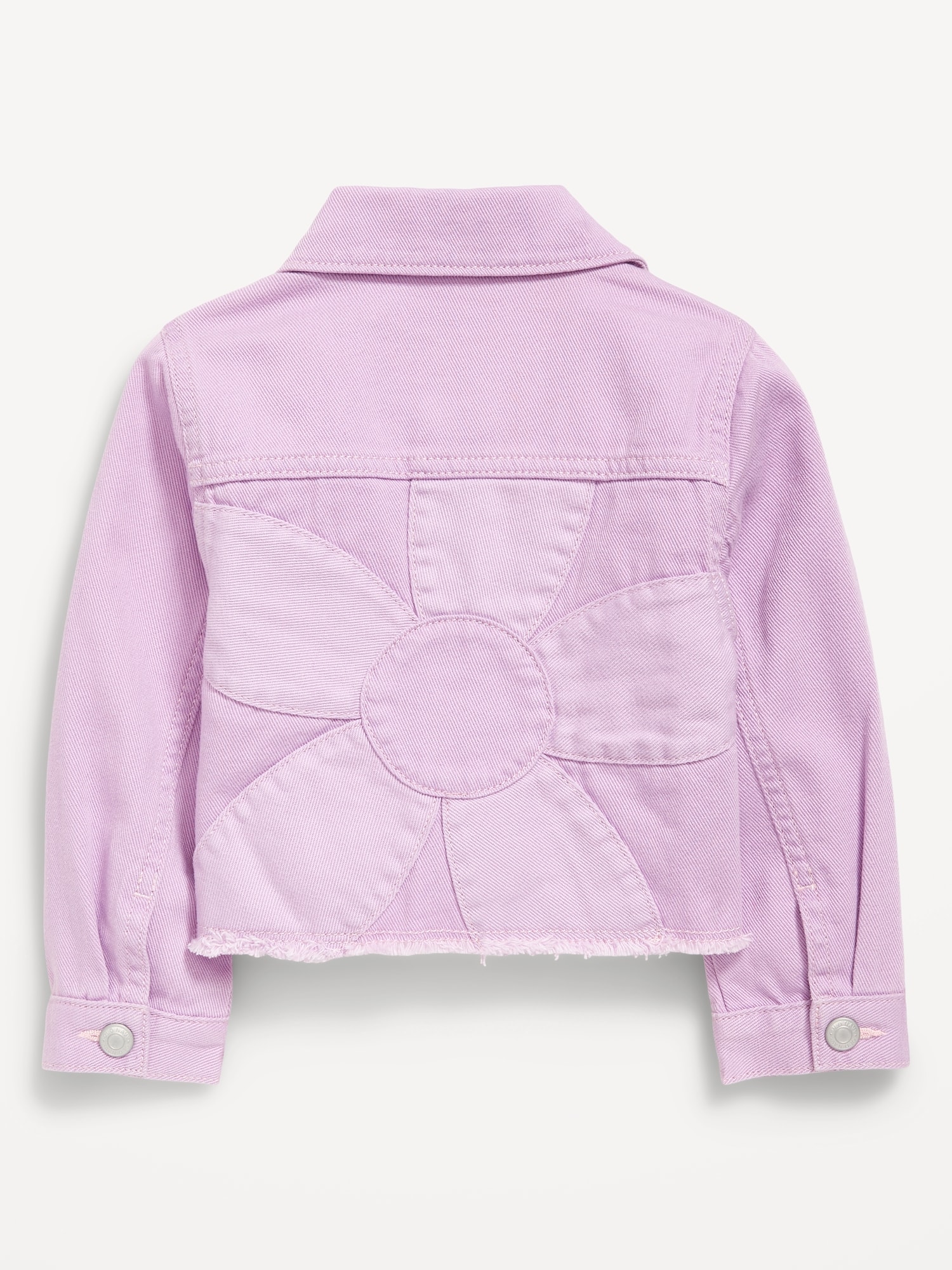 Cropped Twill Flower-Back Jacket for Toddler Girls: pointed collar, long sleeves, patch pockets at chest, large-scale flower at back, full length snap-buttoned placket, cutoff raw hem, #762350