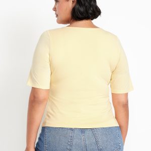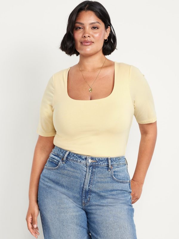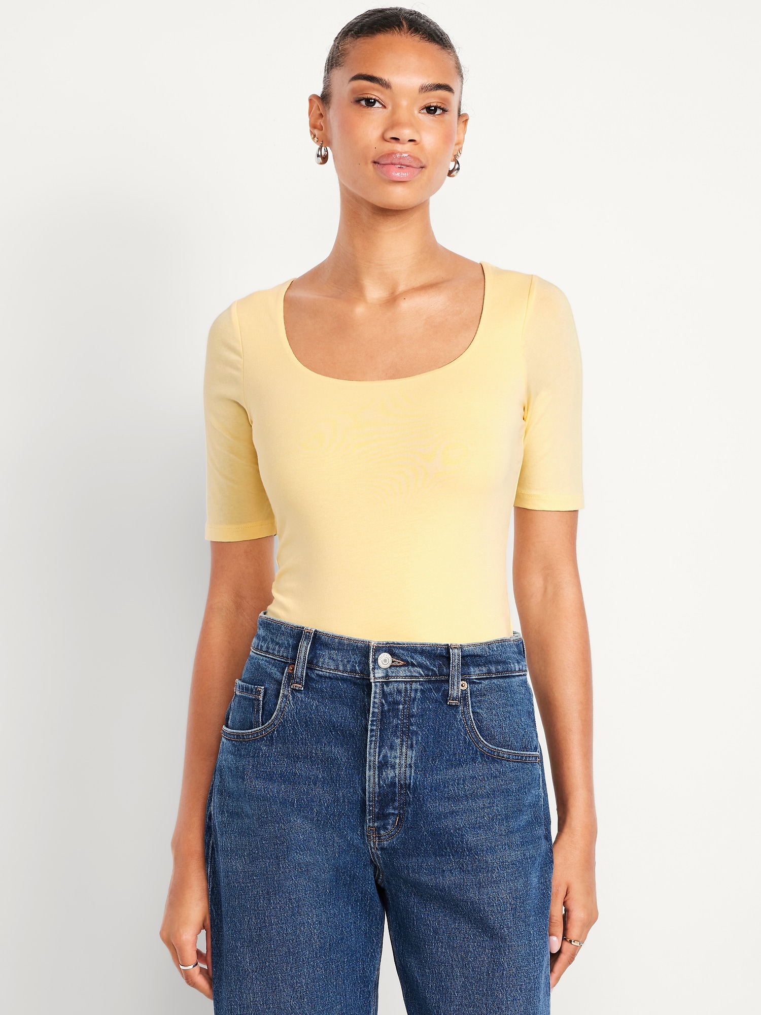 Double-Layer Elbow-Sleeve Scoop-Neck T-Shirt: scoop neck, short sleeves, #749283