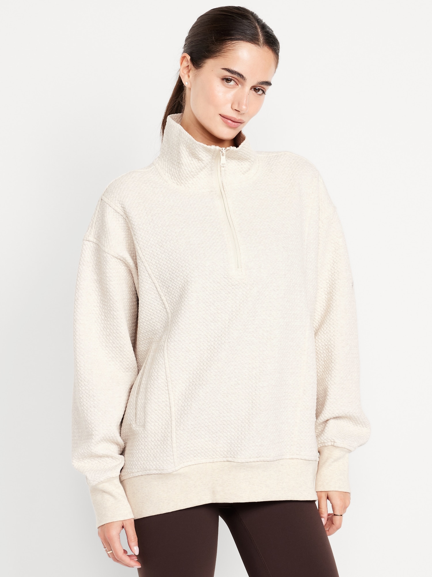 Dynamic Fleece Oversized Textured Tunic Sweatshirt: Featuring Dynamic Fleece. Soft, smooth fleece plus made-to-move stretch.spread collar, drop-shoulder sleeves, half-zip front, vertical welt pockets, rib-knit trim, breathable, #784473