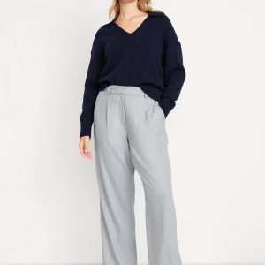 Extra High-Waisted Linen-Blend Taylor Wide-Leg Trouser Pants: Tailored pleats. Loose fit. Don’t do 9-5 (or 5-9) without them.partially-elasticized waistband, hook-and-bar closure, hip pockets, functional back welt pocket, striped print, wide leg, #683376