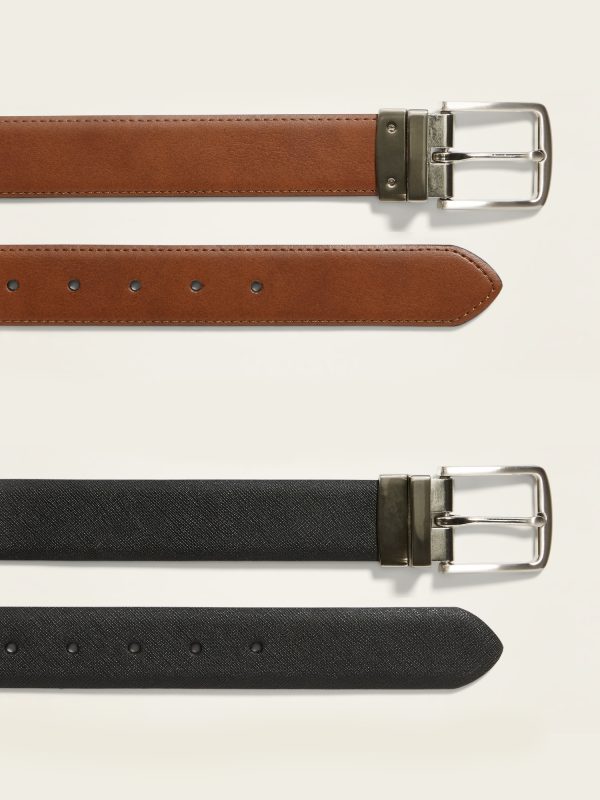 Faux-Leather Reversible Belt: reversible faux-leather belt is dark brown on one side, black on the other, metal buckle, #767722