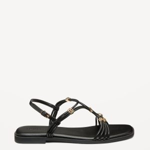 Faux-Leather Strappy Hardware Sandals: faux-leather upper, black: knotted gold-tone detail, bone: knotted silver-tone detail, buckle fastening at ankle, cushioned foot bed, #751054