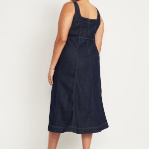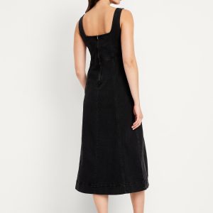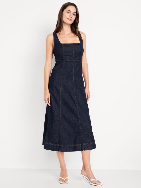 Fit & Flare Sleeveless Denim Midi Dress: square neck, wide straps, center back zipper, seamed skirt, #824527