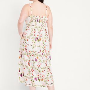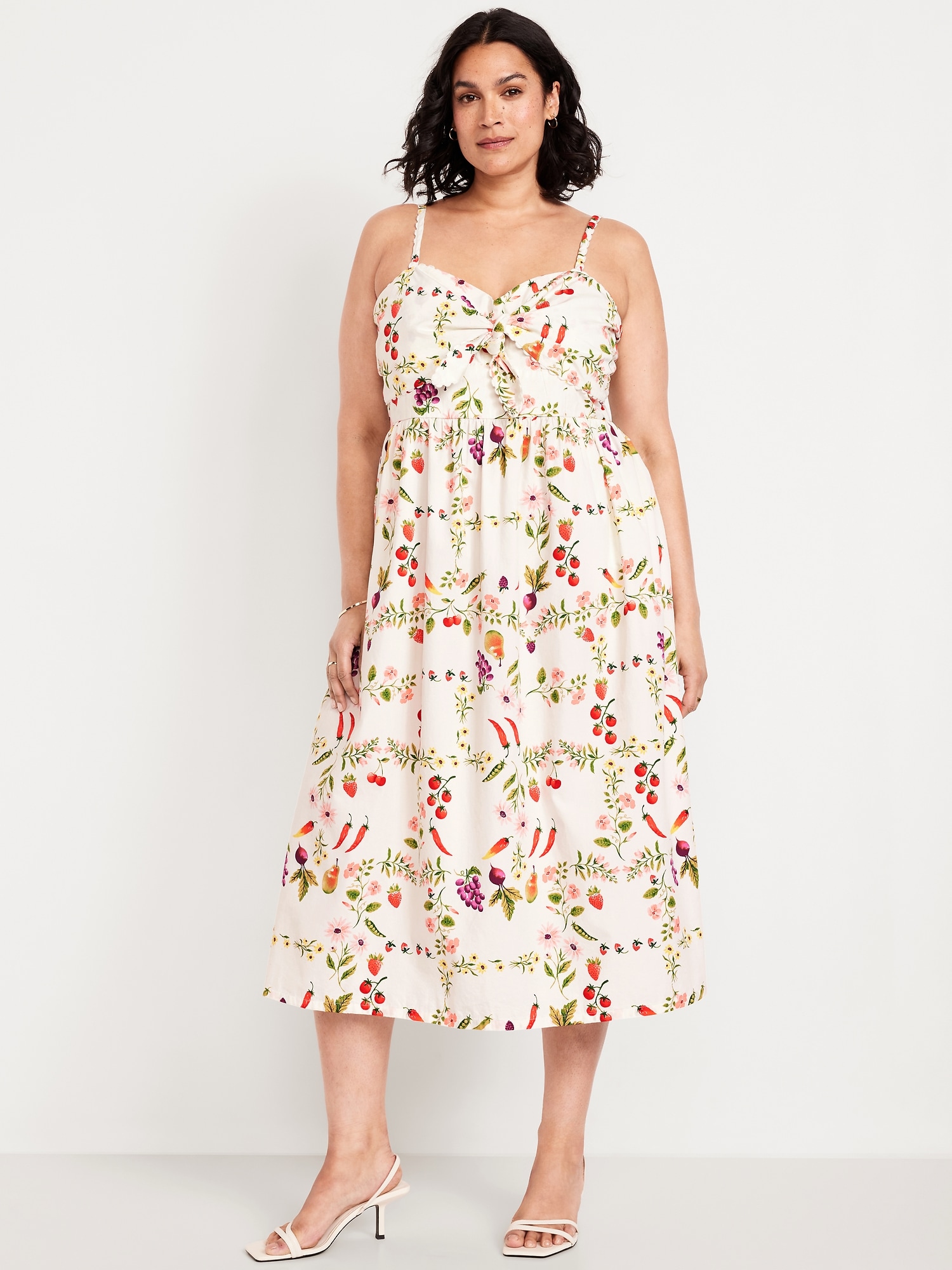Fit & Flare Tie-Front Midi Dress: adjustable straps, knotted tie front, on-seam pockets, seamed shirred waist, smocked back, all-over fruit and floral print, #766927