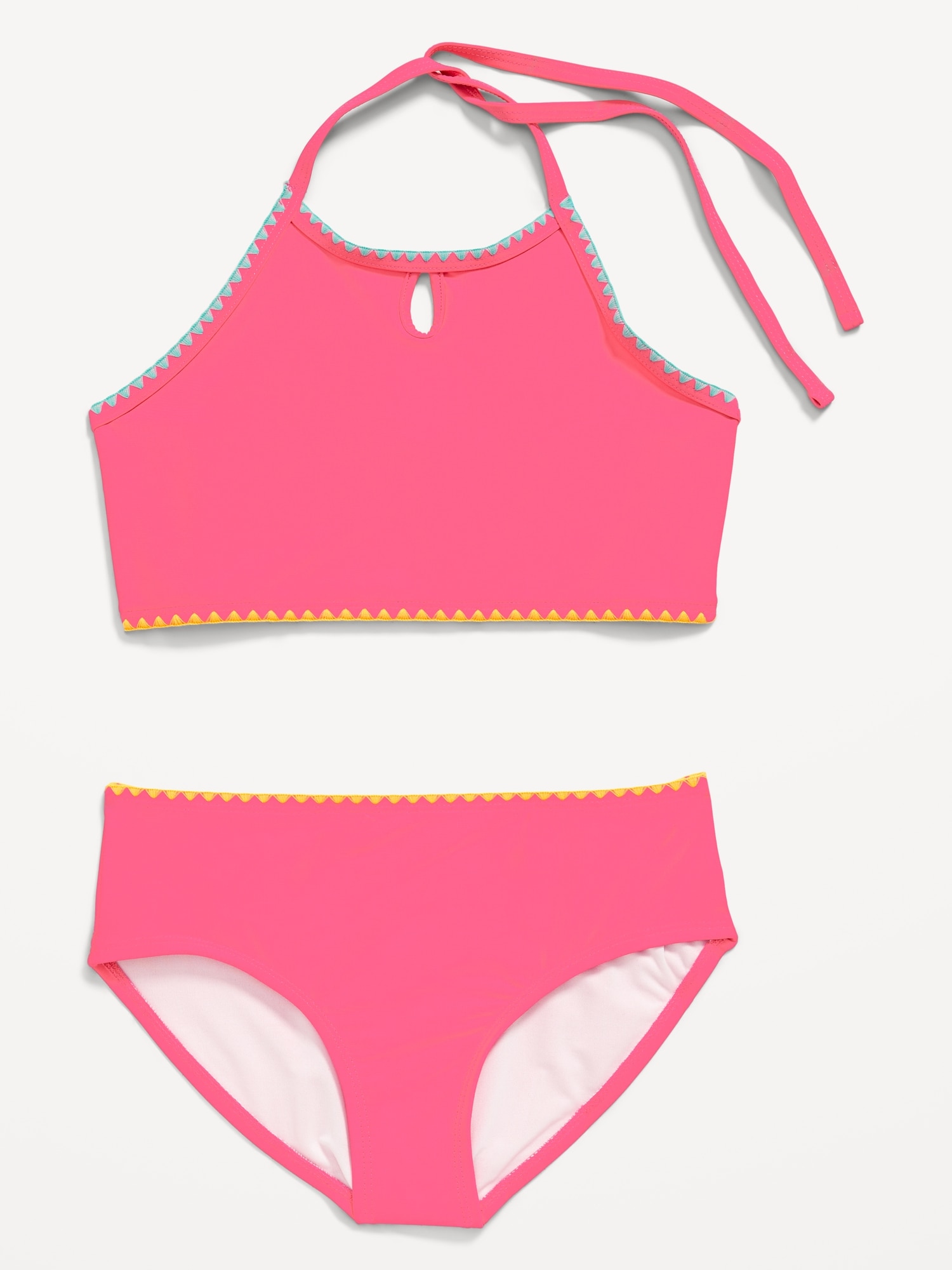 Halter Bikini Swim Set for Girls: halter style neckline, thin straps tie at neck, keyhole at neckline, matching swim bottoms, elasticized waistband, embroidered shell trim, #761917