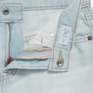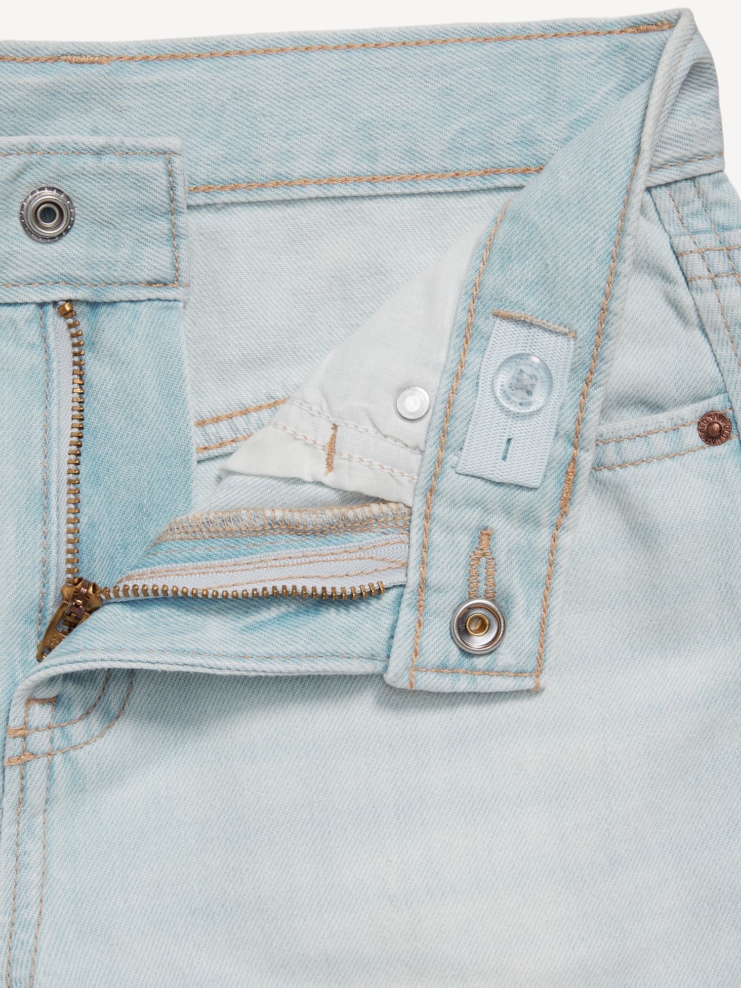 High-Waisted Baggy Frayed-Hem Flare-Leg Jeans for Girls: interior adjustable waistband, sizes 5-8 snap-button closure, sizes 10-20 regular button closure, zip fly, scoop pockets and coin pocket in front, patch pockets in back, flared leg openings, frayed leg cuffs, #704532