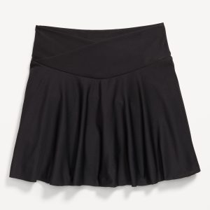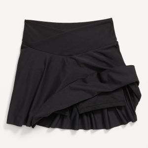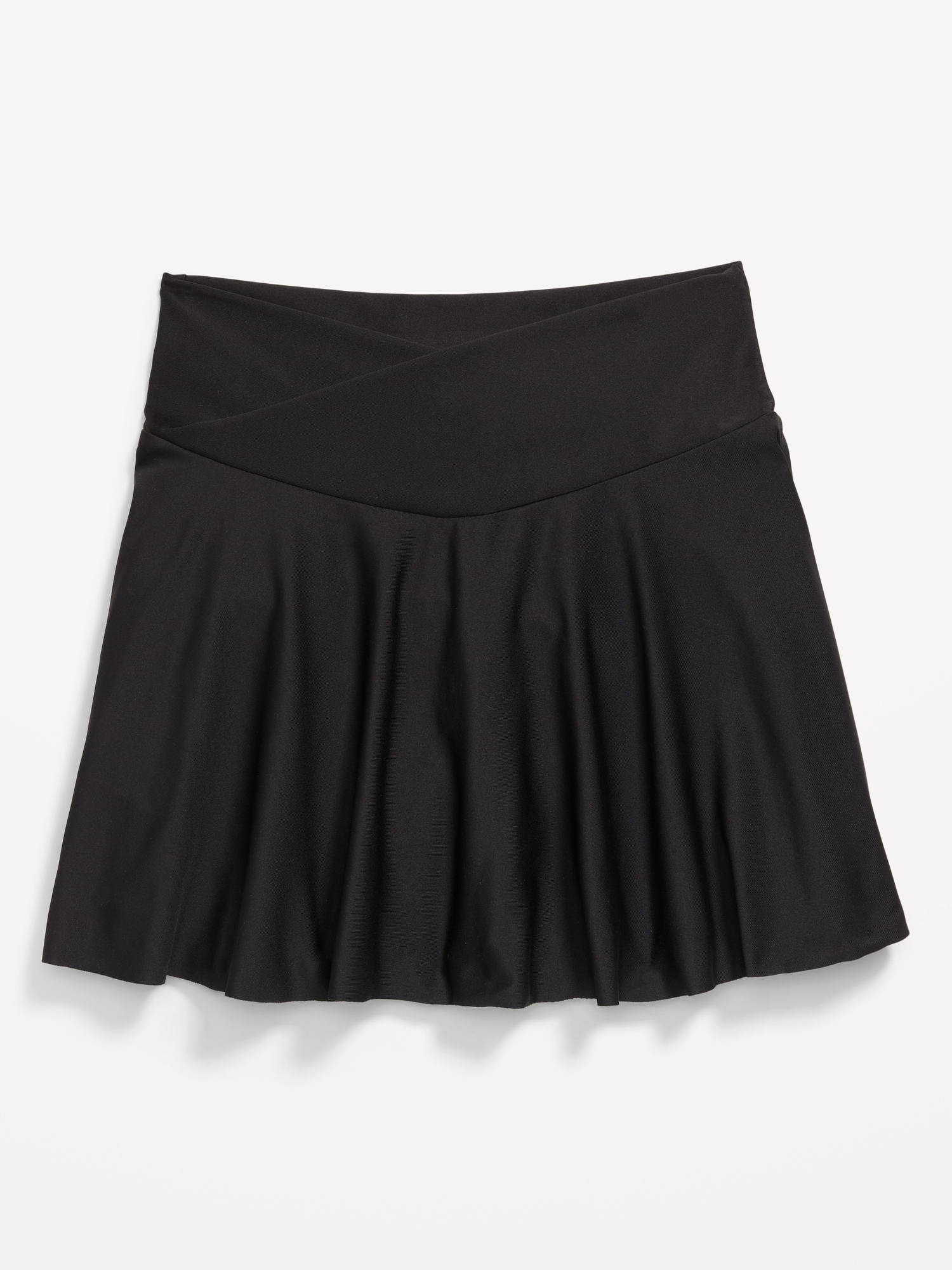 High-Waisted Crossover PowerSoft Skort for Girls: built-in biker shorts, high-rise, crossover elasticized waistband, mini-length skirt, side pocket on shorts, easy pull-on style, #696570
